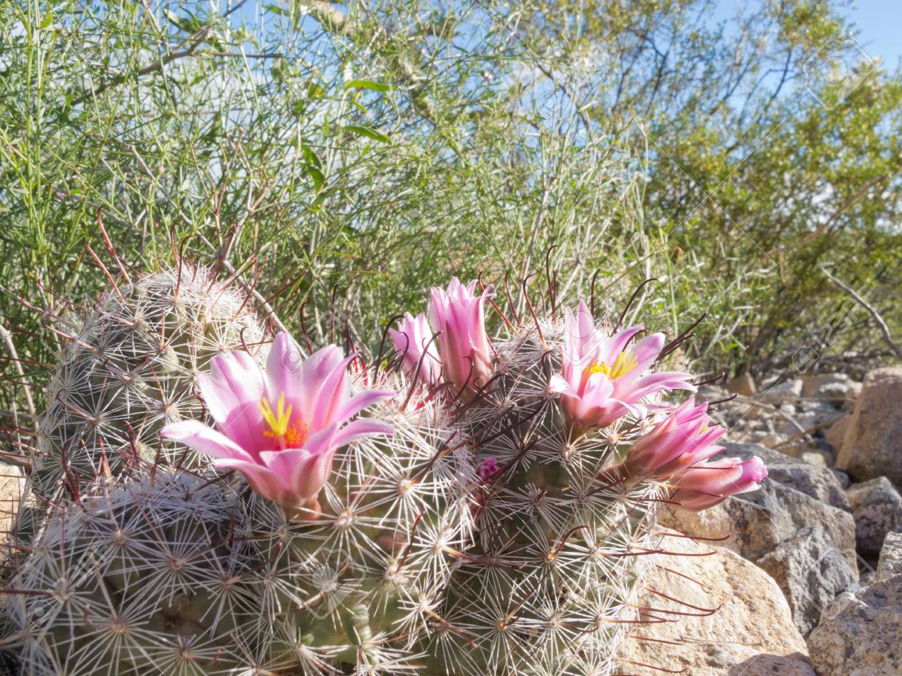 開花の釣り針ピンクッション サボテン マミラリア Grahamii 砂漠の床にクローズ アップ植物 の写真素材 画像素材 Image
